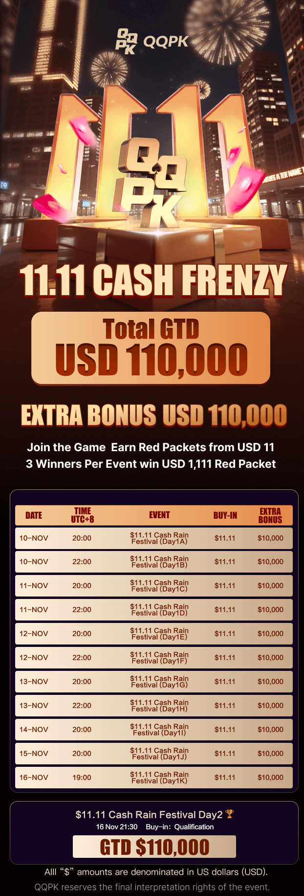 11.11 CASH FRENZY|2025. november 10–16.|110 000 USD garantált nyereményalap – Nyerj milliókat! 11 USD-tól vehetsz részt, és ingyen játszhatod! Minden eseményen 3 × 1111 USD értékű piros borítékot nyerhetsz!