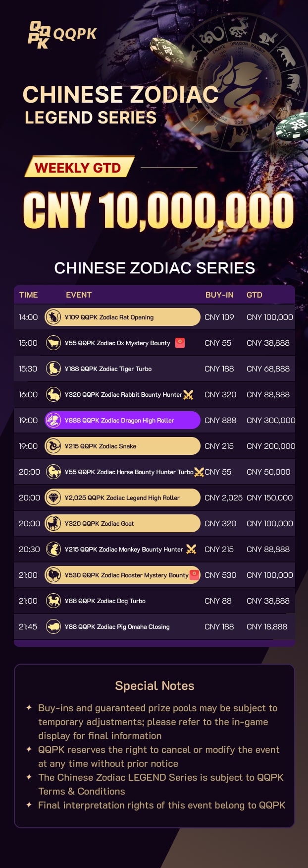Chinese Zodiac Legend Series, garantált 10 millió CNY hetente és 13 izgalmas esemény naponta! Mystery Bounty, Hunter, High Roller és Turbo versenyek – minden formátumot lefedve, többféle nevezési díjjal. Csatlakozz az akcióhoz már 55 CNY-ért, vagy küzdj meg a végső koronáért a 2025 CNY-s Zodiac King csatában! Akár újonc vagy, akár tapasztalt harcos, ez a bátrak csatatere!