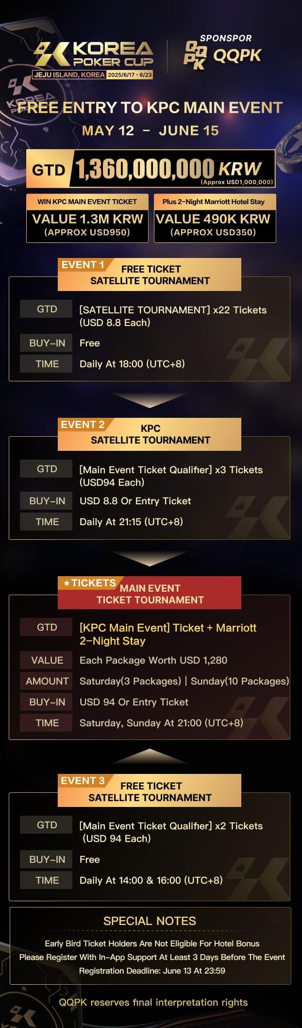 A KPC 2025. június 17. és 23. között kerül megrendezésre a dél-koreai Jeju-szigeten! A torna garantált nyereményalapja 6 900 000 CNY! Ingyenes selejtező jegyek már elérhetők! Itt a lehetőség, hogy a legjobb játékosok mellett versenyezzél! Lépj fel a KPC színpadára, nyerj több százmilliós nyereményeket, és teremts magadnak egy felejthetetlen pókerélményt!