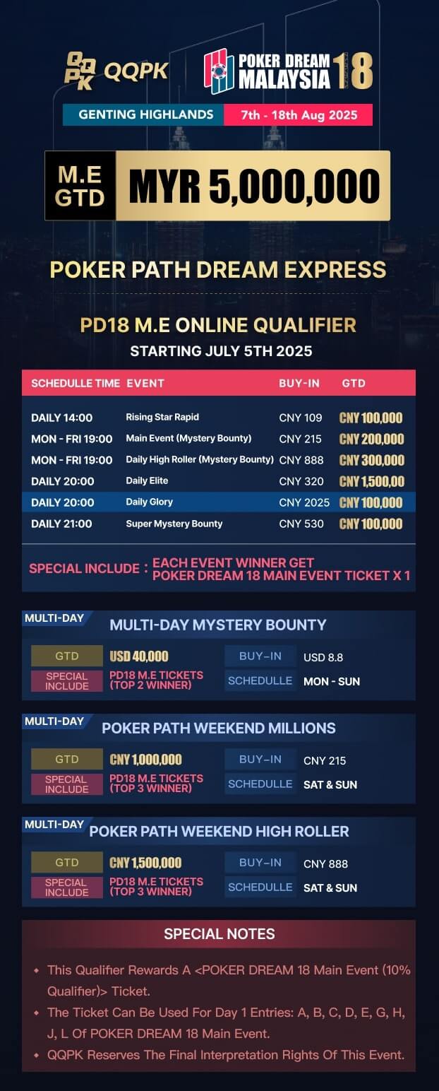 A POKER DREAM 2025 augusztusában hatalmas visszatéréssel jelentkezik! A nagy várakozással kísért visszatérés – a POKER DREAM 18 – a malajziai Genting Highlandsban kerül megrendezésre, egy epikus Main Eventtel! Csatlakozz a 12 napos pókerfesztiválhoz, és szerezd meg online a jegyed, hogy esélyt kapj a 5 000 000 MYR értékű álomszintű versenyre!
