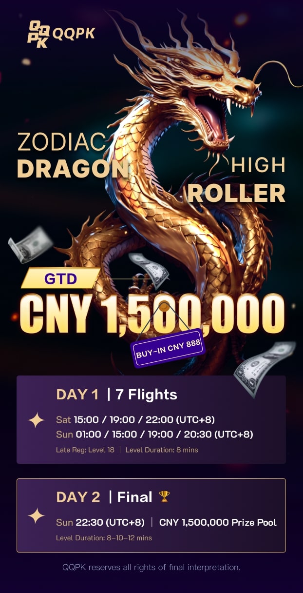 A QQPK Zodiac Dragon Weekend High Roller minden szombaton és vasárnap megrendezésre kerül|Bejelentkezési díj: 888 CNY|Garantált nyereményalap: 1 500 000 CNY. Hét izgalmas hétvége vár rád! Csatlakozz a valódi pókerjátékosok végső leszámolásához — a helyek száma korlátozott, regisztrálj most!