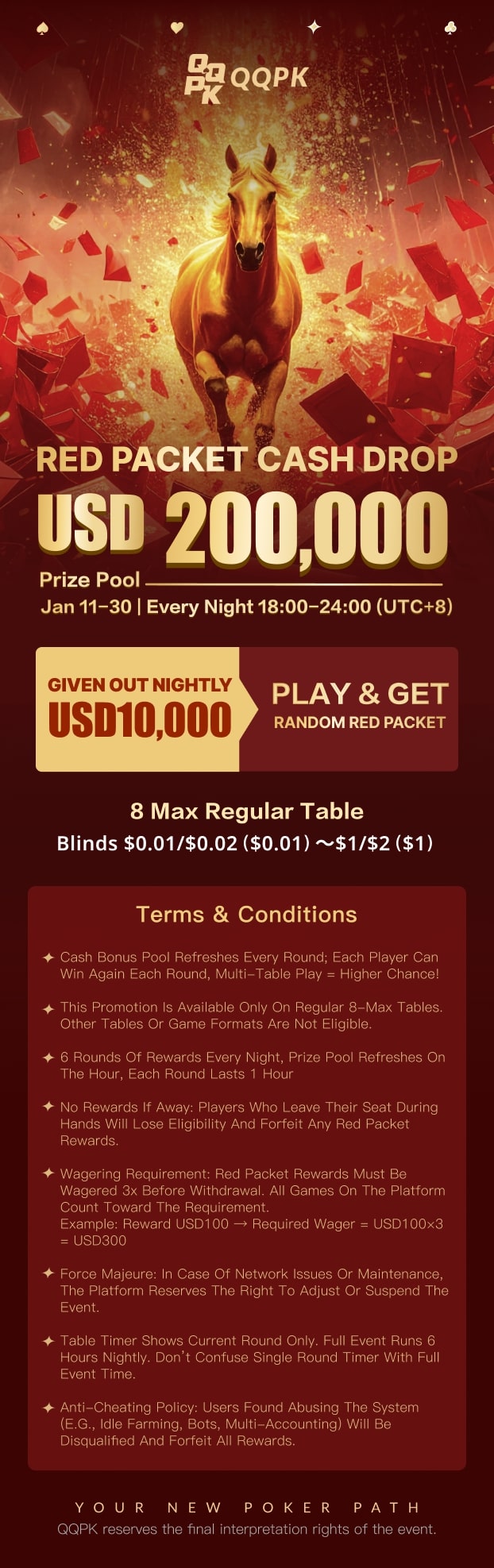 Red Packet Cash Drop, január 11-30 (UTC+8), a Red Packet Rain minden este 18:00-24:00 között zajlik, 200 000 USD nyereményalappal. A promóció ideje alatt minden este 10 000 USD kerül kiosztásra, a véletlenszerűen kiválasztott Red Packet összegek azonnal jóváírásra kerülnek – nincs szükség kézi igénylésre. Csak a szokásos 8-max asztalokon érhető el. Ha egyszerre több asztalon is játszol, növeled az esélyeidet. Csatlakozz most és szerezd meg a részed!