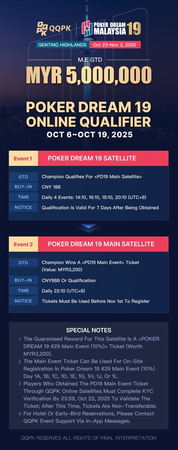 A nagy várakozással kísért Poker Dream 19 2025. október 23. és november 3. között kerül megrendezésre a malajziai Genting Highlandsban! Most már online szatelliteken keresztül is kvalifikálhatod magad a Main Eventre! Hatalmas garantált nyereményalapokkal és világszínvonalú struktúrákkal ez a sorozat újra fel fogja pezsdíteni az ázsiai póker szférát.