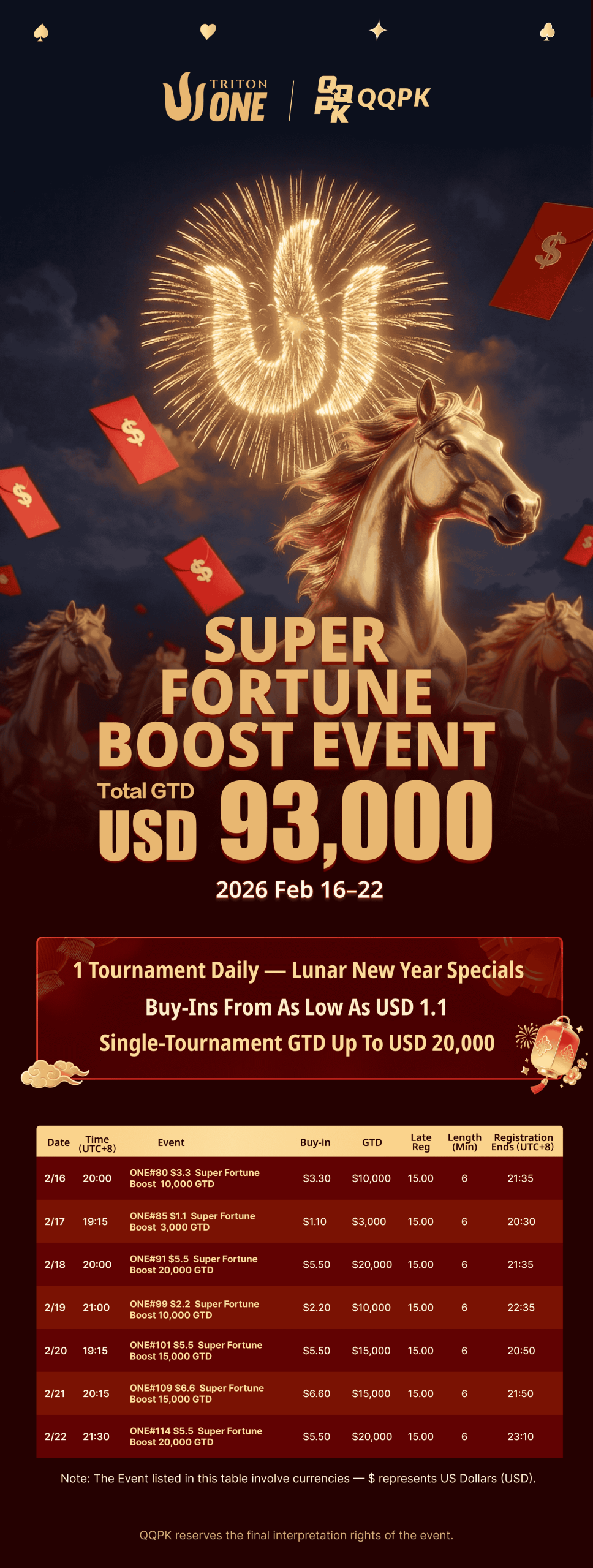 A Super Fortune Boost esemény február 16-22. között zajlik, összesen 93 000 USD garantált nyereményalappal, minden nap egy értékes eseménnyel! A nevezési díj mindössze 1,1 USD, az egyes események garantált nyereményalapja pedig 20 000 USD – csatlakozz és indítsd be az újévi szerencsédet!