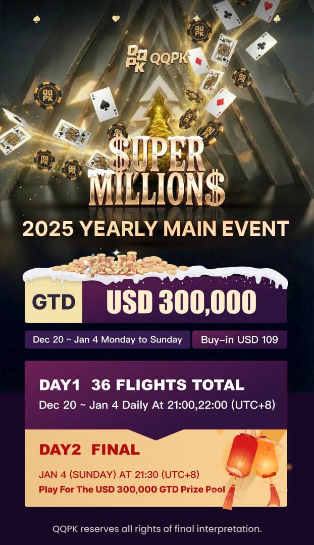 SUPER MILLION$ 2025 Yearly Main Event – Officially Begins! 300 000 USD garantált nyereményalap! Csatlakozz az év legnagyobb nyereményalapjához a végső versenypályán. December 20. és január 4. között napi két verseny kínál rugalmas lehetőséget a dicsőséges évzáráshoz. Regisztrálj most, biztosítsd a helyed, és tedd felejthetetlenné ezt a karácsonyt és új évet! Eljött a végső leszámolás ideje!