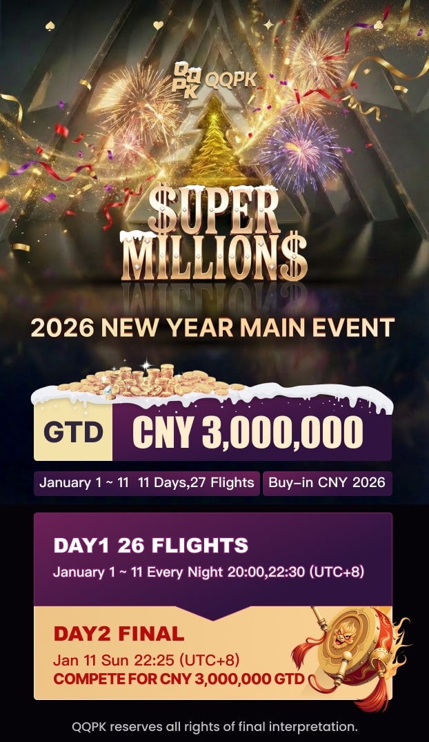 SUPER MILLION$ 2026 Yearly Main Event- Officially Begins! 300 000 USD garantált nyeremény! Csatlakozz az év legnagyobb nyereményalapjához a végső versenypályán. Január 1. és 11. között napi két verseny kínál rugalmas lehetőséget a dicsőséges évzáráshoz. Regisztrálj most, biztosítsd a helyed, és nyerd meg a több millió dolláros jackpotot! Eljött a végső leszámolás!