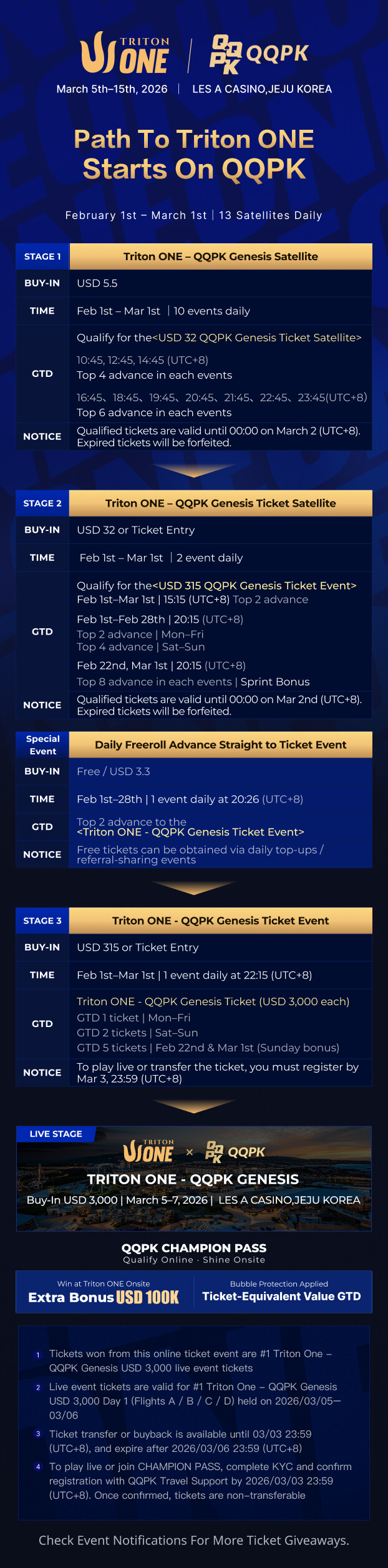 A Triton ONE online szatellitversenyek február 1. és március 1. között indulnak, naponta 13 szatellitversennyel, már 5,5 USD-tól. Harcolj a helyedért, és kvalifikáld magad közvetlenül a Triton ONE pluszra! A QQPK CHAMPION PASS már elérhető – kvalifikáld magad online, ragyogj élőben, és nyerj extra 100 000 USD bónuszt, ha a helyszínen megszerezed a címet. Csatlakozz most, és biztosítsd helyed a főversenyen!